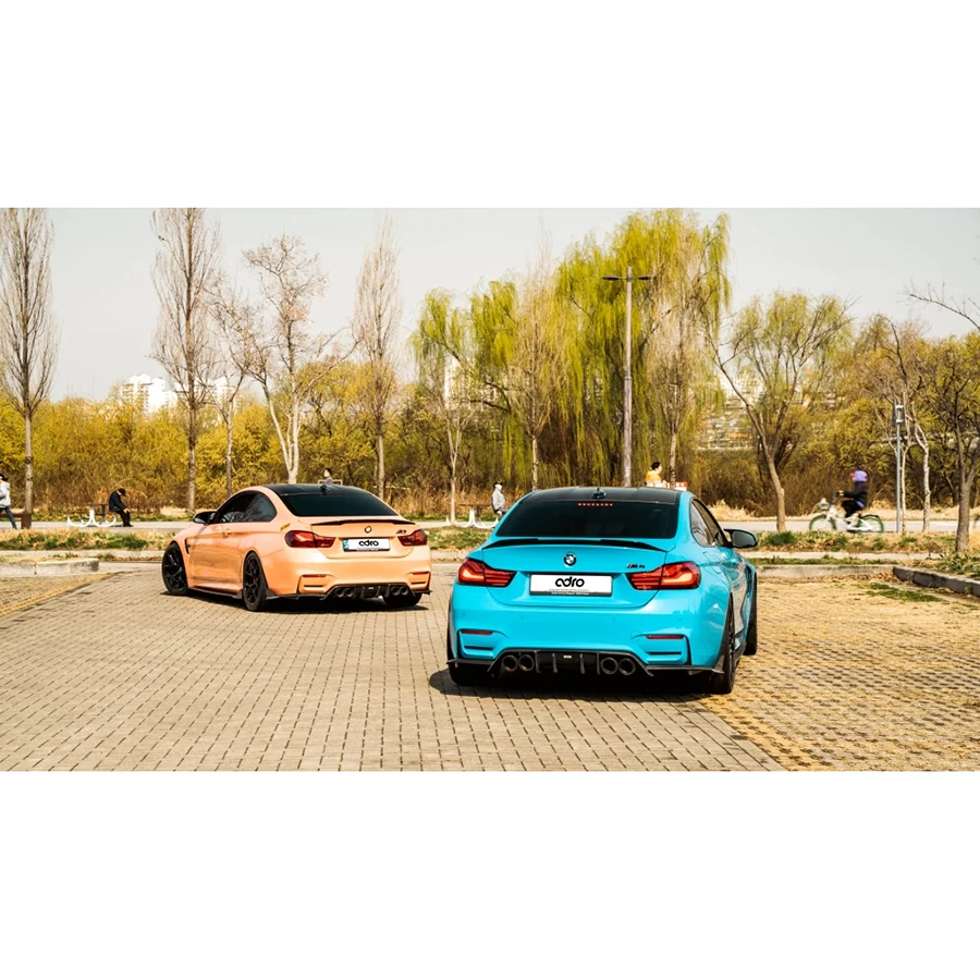 While some of the F82 BMW M4s have the optional rear trunk spoiler from the factory, a lot of owners find that it’s not quite aggressive enough for their car; especially if they have a lot of other carbon fiber or cosmetic modifications installed. ADRO developed this hand-crafted carbon fiber spoiler for the BMW M4 that draws some inspiration from the optional OEM spoiler, but adds a whole new level of aggression. This carbon fiber BMW M4 spoiler sits higher than the factory spoiler and has angled edges to compliment the sharp edged styling of the F82 M4. Plus, you may even feel a slight increase in downforce when compared to the OEM counterpart, thanks to its elevated and more aerodynamic design that allows for more air to pass under the wing to create more downforce. This carbon fiber spoiler is one of the easiest parts to install and will immediately take your M4 to the next level in performance and design.