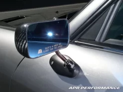 Size matters. So when it comes to reducing aerodynamic drag to a car, the APR Formula GT3 Mirrors are an excellent choice. The APR Formula GT3 Carbon Fiber Mirrors are designed to give race inspired looks with the functionality of reducing drag and eliminating blind spots with wide angle mirror lenses.