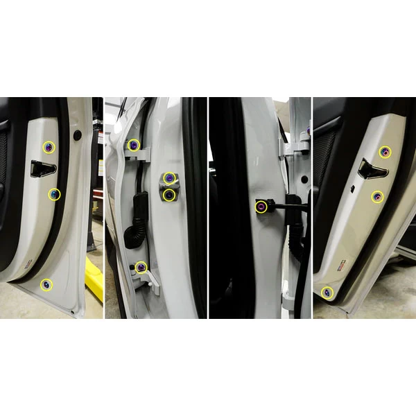 Dress Up Bolts Titanium Hardware Door kit for the BMW F80 M3 is designed to replace the door latches, striker plates, rear door hinges, and door checks.
