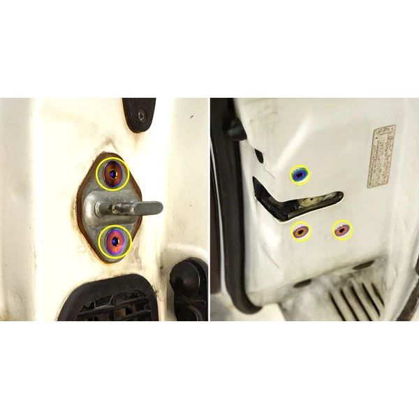 Dress Up Bolts Titanium Hardware Door kit for the Toyota Supra MKIII is designed to replace the door latch and striker plate hardware.