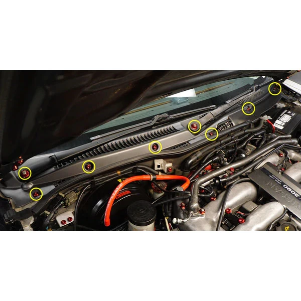 Dress Up Bolts 8 piece window cowl kit includes screws and nuts manufactured from extremely durable, anticorrosive, and lightweight GR5 titanium metal. The kit is designed for the Nissan 300ZX (Z32).
