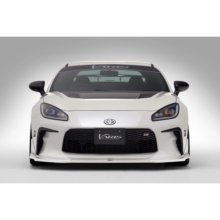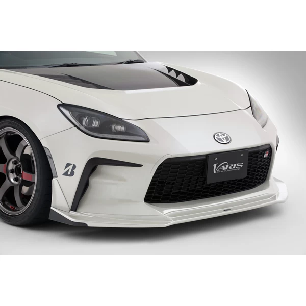 FRP front spoiler with under panel for the 2nd generation Toyota GR86. The lip spoiler and L/R turbulators have a three-piece structure. The under panel has an integral structure, and a vertical fin is attached to the bottom surface.